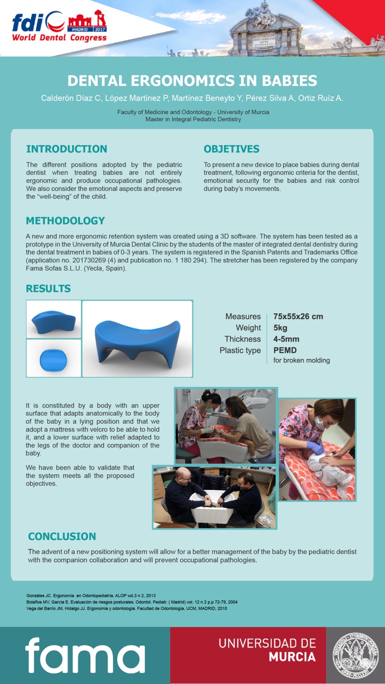 Fama mit dem Ziel neue Lösungen in anderen Bereichen als dem Haus zu schaffen, hat ein spezifisches Produkt für die Welt der Zahnmedizin entwickelt.In diesem Fall die Doktorin Paloma López zusammen mit dem Pädiatrischen Zahnarzt-Master-Studiengang der Universität von Murcia haben auf den vorhandenen Bedarf innerhalb der chirurgischen Dienste im Allgemeinen und innerhalb der pädiatrischen Zahnheilkunde insbesondere der Schaffung einer Trage angeganen, um die Durchführung von Behandlungen für Babys zu erleichtern.