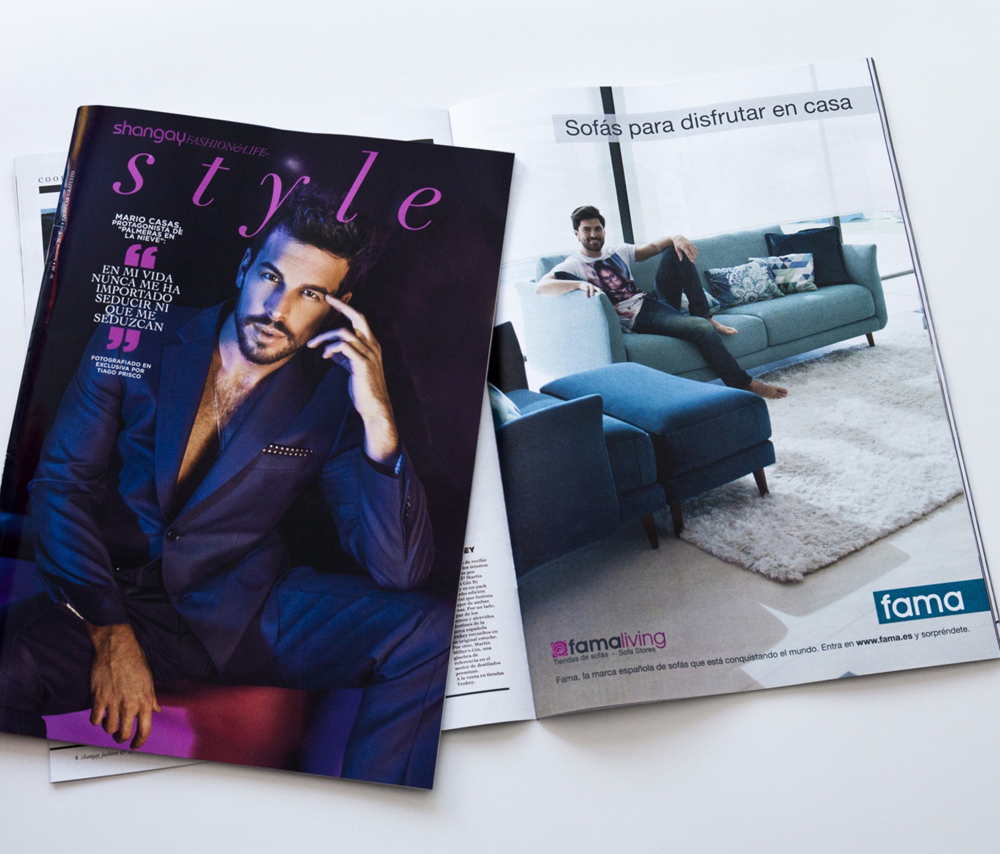 In der letzten Ausgabe der Zeitschrift Shangay Style mit Mario Casas auf die Vorderseite kann man unser Sofa Helsinki mit Stoffen der neuen Kollektion 2016