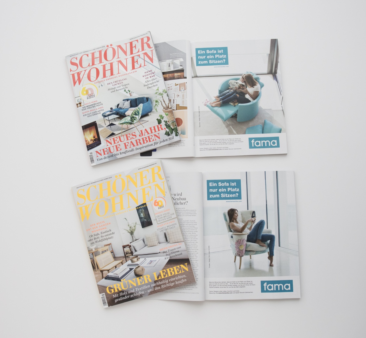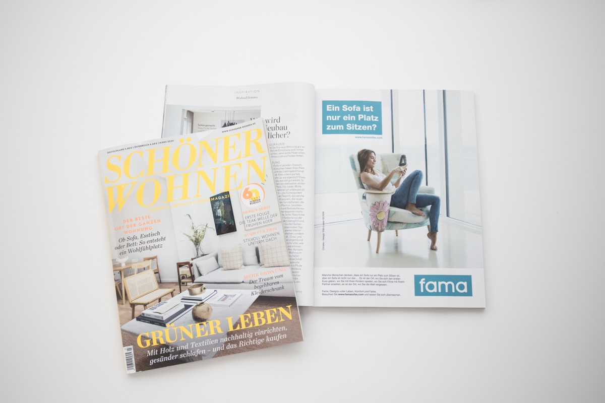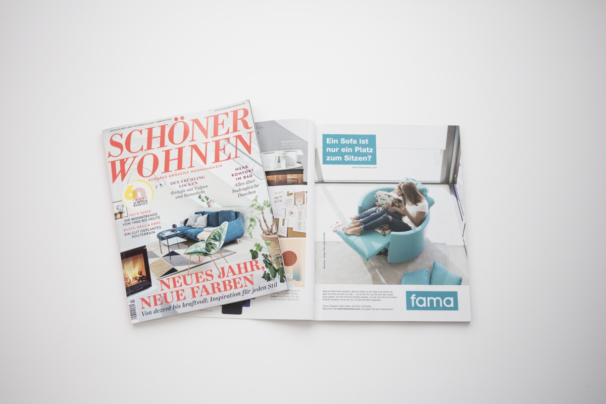 Im Jahr 2020 wird Fama in den verschiedenen Ausgaben des renommierten Einrichtungsmagazine Schöner Wohnen zu sehen sein. Im Laufe des Jahres werden verschiedene Modelle der Fama Designs zu sehen sein, vor allem die Bestseller der Marke auf dem deutschen Markt. Fama etabliert sich immer mehr auf dem anspruchsvollen deutschen Markt und erweitert die Verkaufsstellen im Land. Mit dieser Aktion soll die Sichtbarkeit beim Endkunden erhöht werden.
