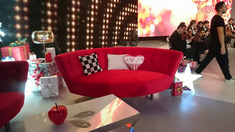 Fama war auf der letzten Heiligabend Gala von Telecinco ,,La noche en Paz” (ein Fernsehprogramm vom Sender Telecinco in Spanien) anwesend. Zwei Sofas in rot haben den farbige und feine Touch einem so speciellen Abend gegeben.