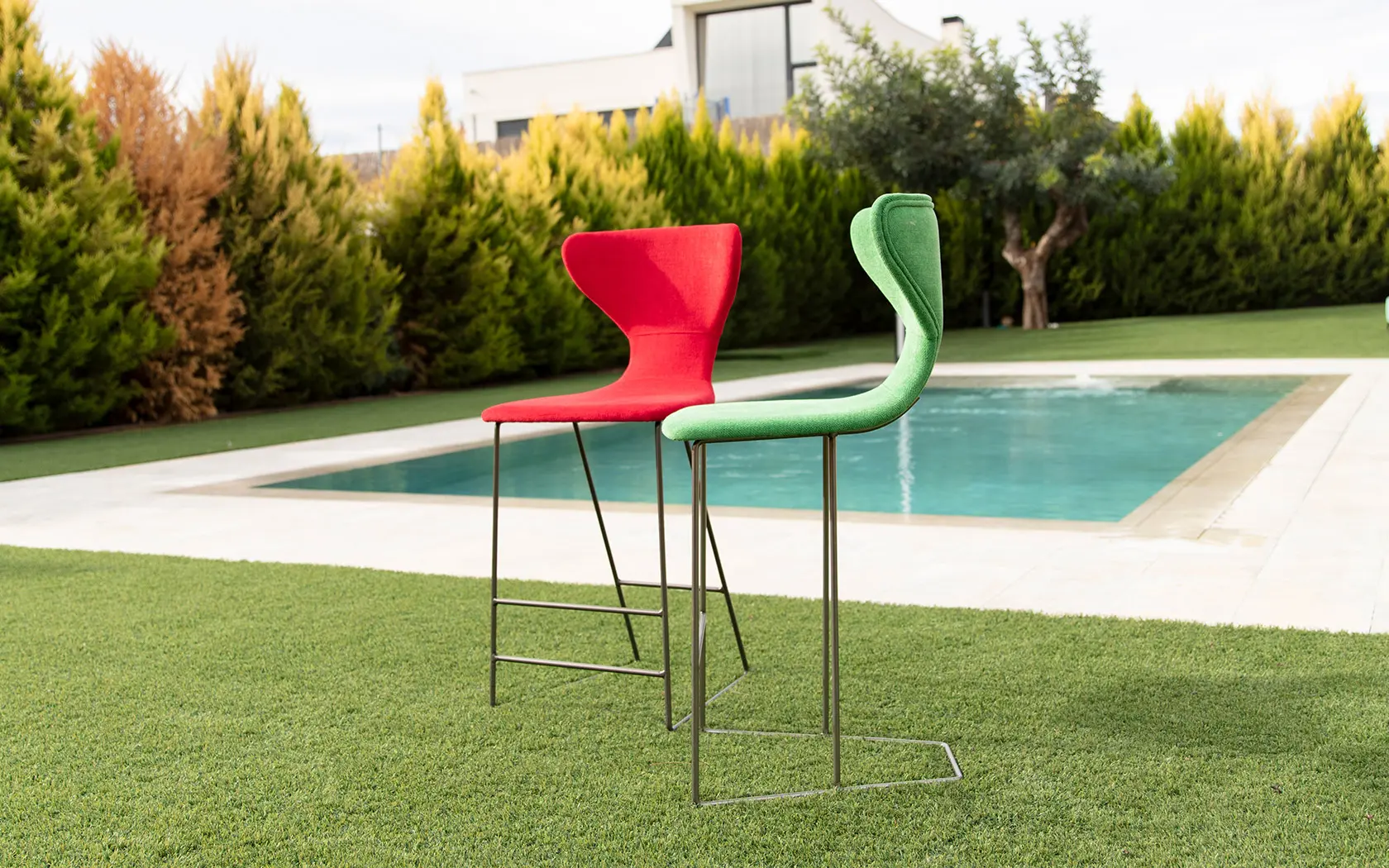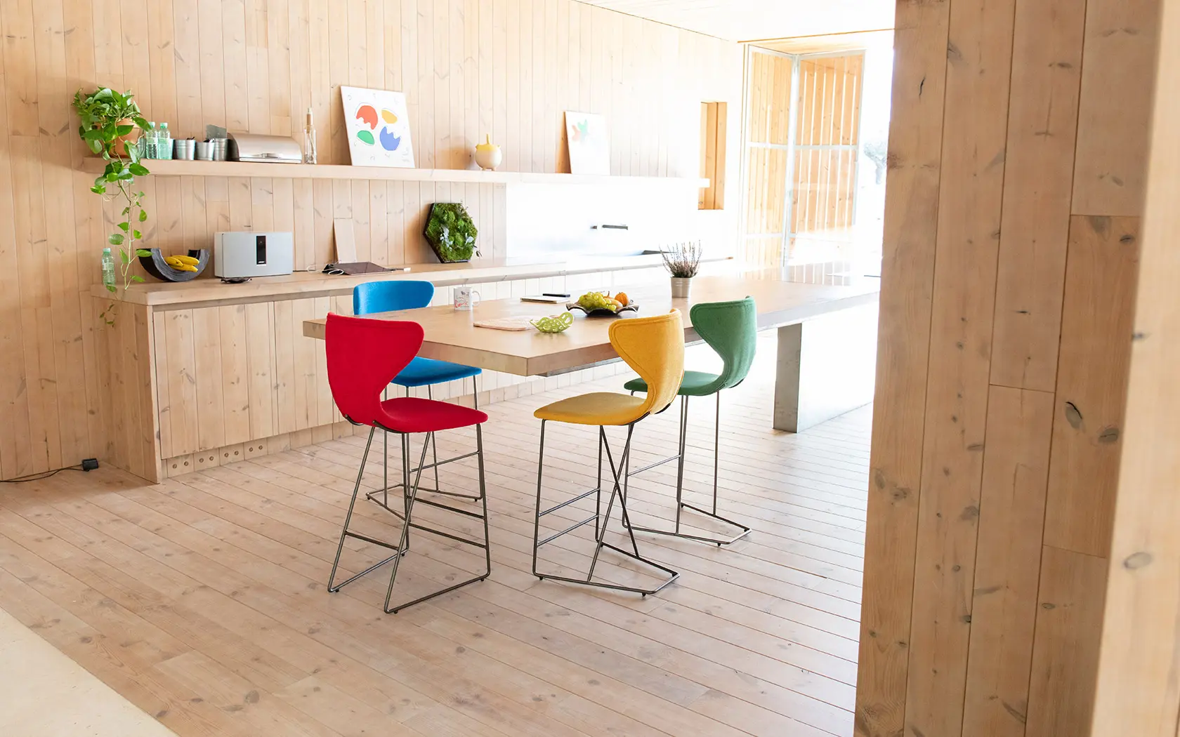With this in mind, we have created Helga, with wooden legs, and Marlon, Denzel and Burt with metal rod legs, all of them available in 3 seat heights, 45 cm (chair version), 65 and 75 cm (stool version). They stand out due to their ergonomic design and great comfort. The Denzel, Marlon and Burt models in the chair version (seat height 45cm) can be used as independent decorative pieces thanks to their metal rod foot, without having them as dining chairs.