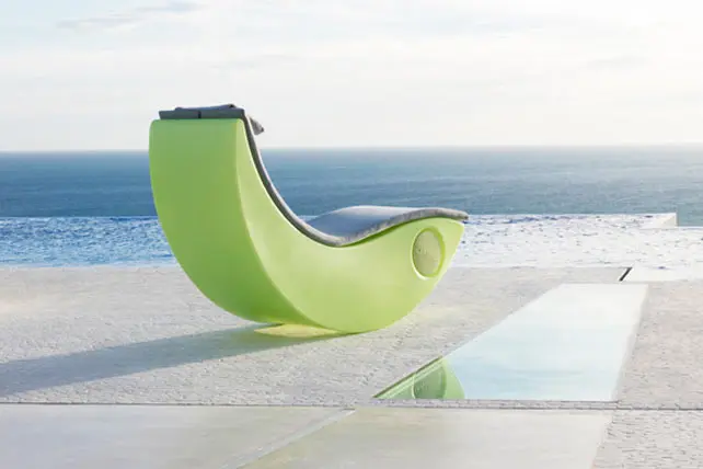 Chaise longue basculante avec base de polyéthylène disponible dans deux couleurs:Orange et Pistache. Avec un simple mécanisme de contrepoids,on peut obtenir la position désirée envariant le centre de gravité. Le matelas estdéhoussable.