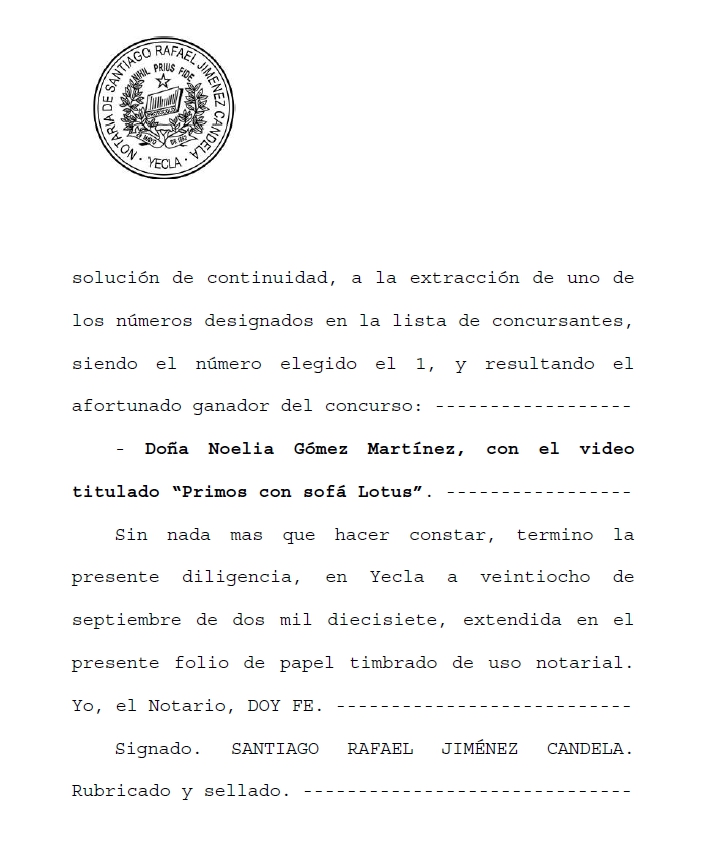 Parmi les 11 participants, nous avons réalisé un tirage au sort devant notaire et le gagnant a été la vidéo intitulée « Primos con sofá Lotus » envoyé par Noelia Gómez Martínez. Noelia qui a acheté son canapé chez Famaliving Granollers pourra profiter d’un voyage à Disneyland Paris en compagnie de sa famille. Félicitations !