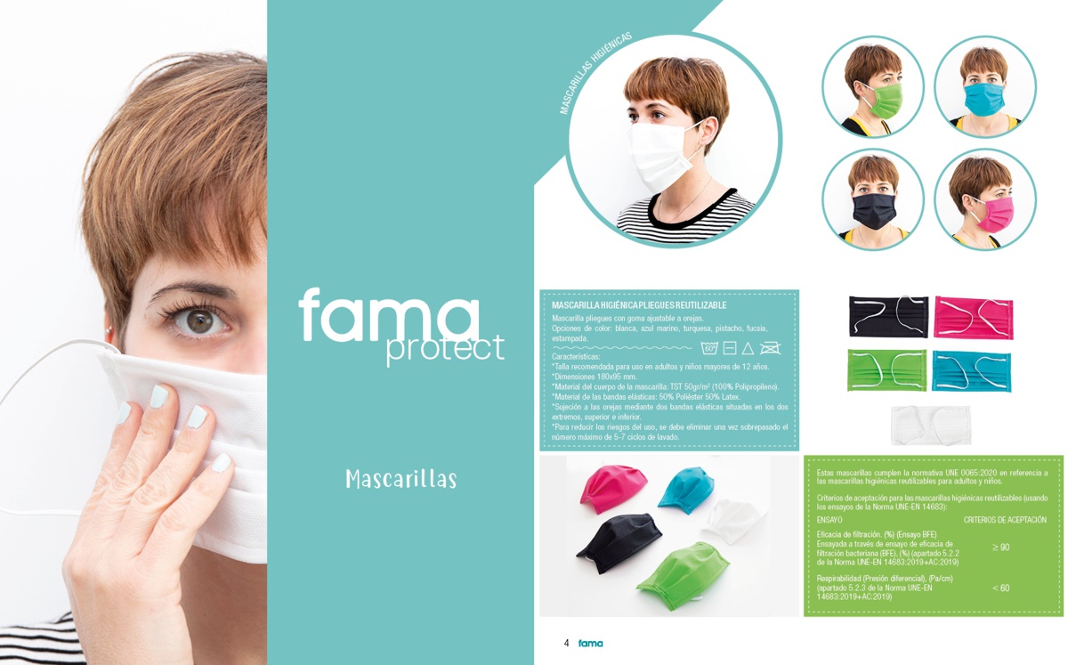 Suite à notre expérience de ces dernières semaines et dans la recherche de la diversification de notre activité économique, nous présentons Fama Protect, la nouvelle division liée au matériel de protection. Il a fallu des semaines de travail constantes pour explorer de nouvelles formes de production qui nous ont conduits à obtenir l’homologation de tous les nouveaux produits que nous présentons.
