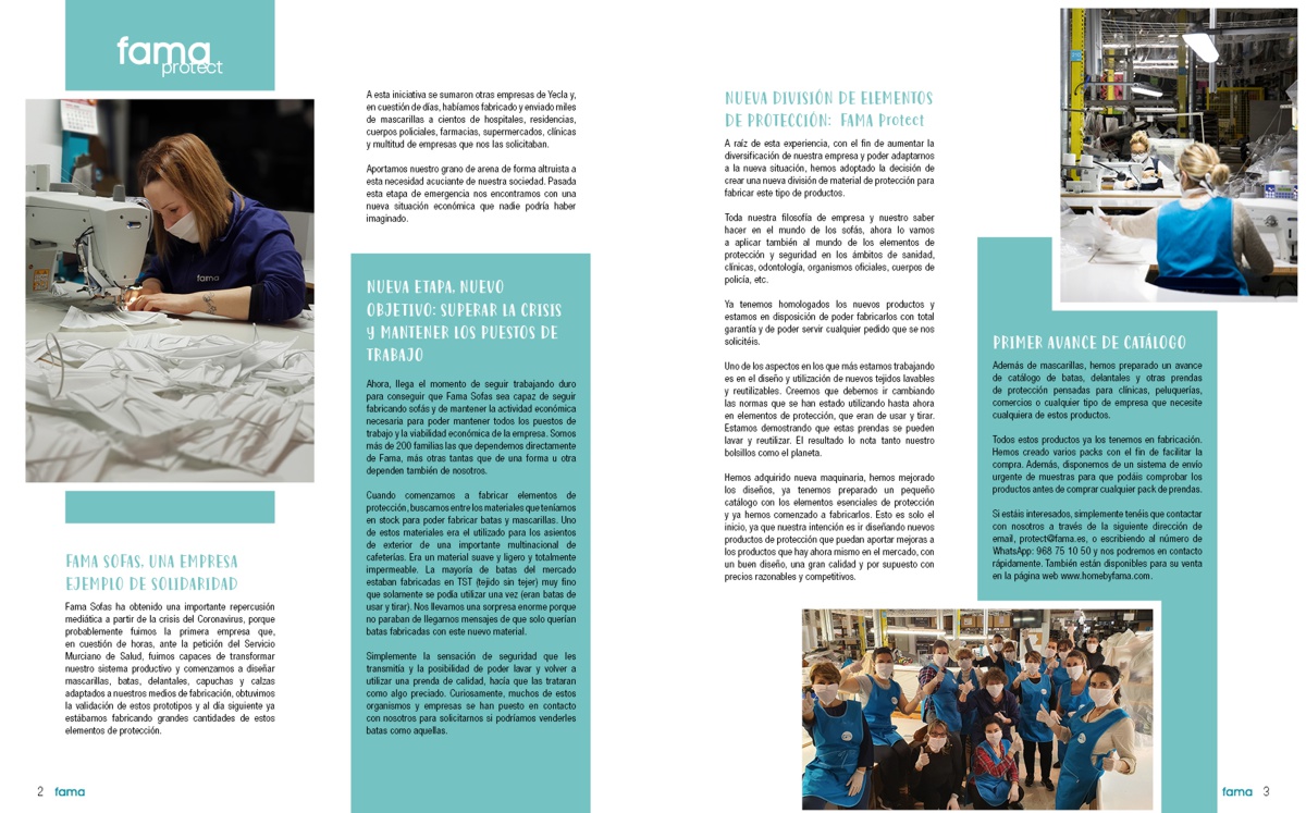 Ces dernières semaines, nous avons tous vécu de nombreux changements et nous avons dû nous adapter à cette crise du Covid19. Chez Fama, nous avons arrêté notre fabrication habituelle de canapés pour nous mettre à apporter notre grain de sable en réalisant des masques de manière solidaire. Une initiative qui s’est poursuivie et à laquelle se sont joints un grand nombre d’entreprises de Yecla. Après ces premières semaines de solidarité, nous sommes peu à peu revenus à notre activité habituelle. Bien que nous n’ayons pas encore un volume de production pour tous nos travailleurs, nous avons besoin de voir différentes formes de viabilité économique de l’entreprise afin de pouvoir continuer avec un volume de travail pour les 200 employés qui forment Fama.