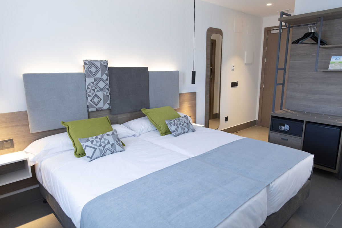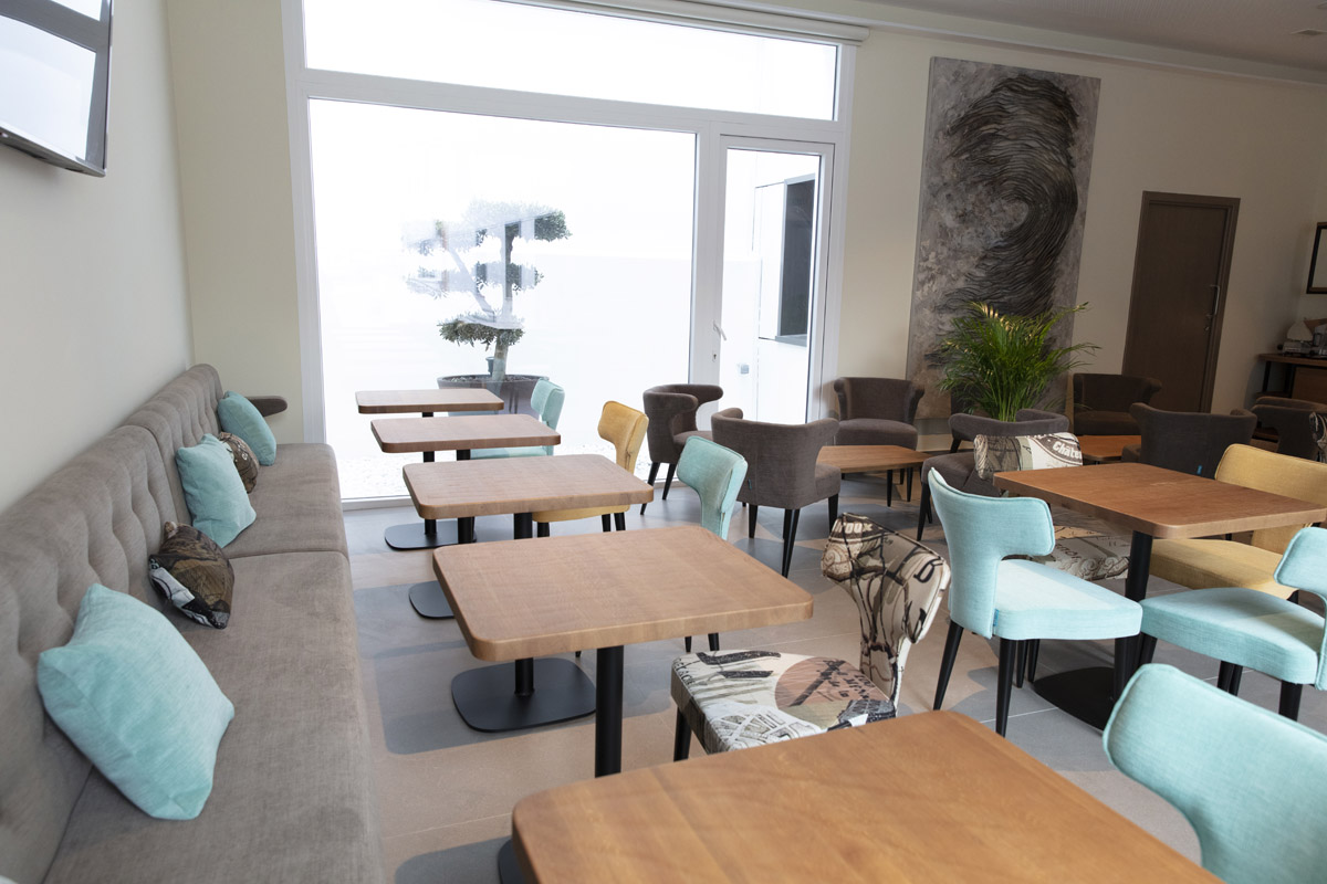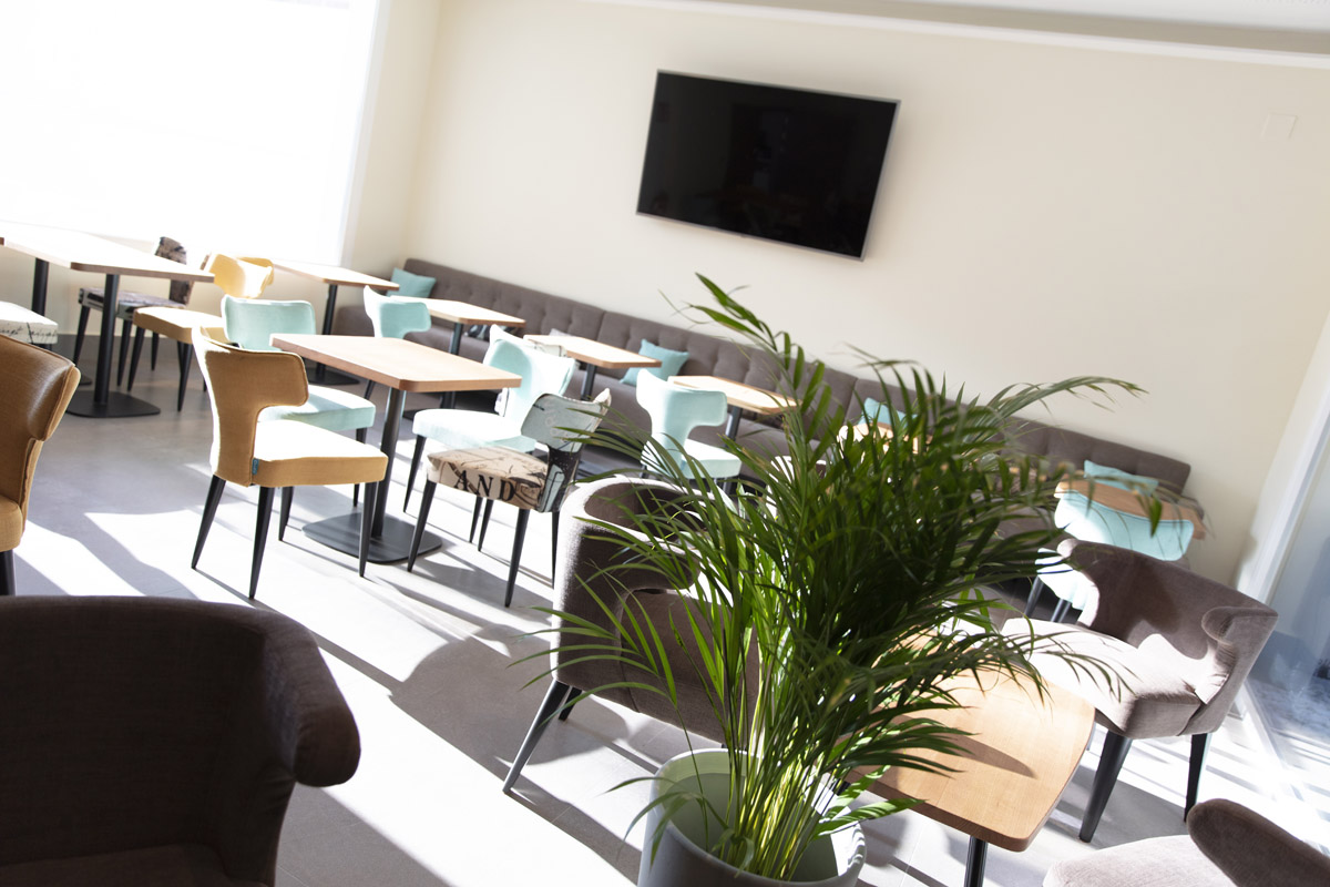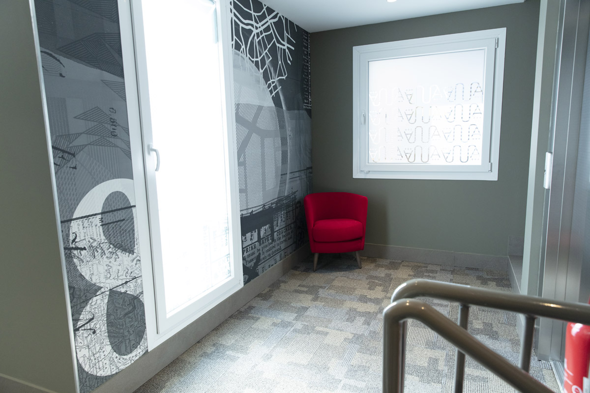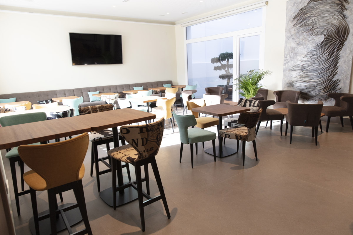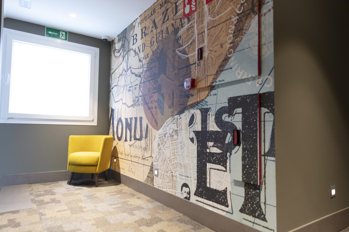 Pour les espaces communs, le mobilier d'accueil a été conçu avec des finitions en chêne et en Krion, accompagné de tables hautes avec impression numérique, avec leur propre design sur le dessus ainsi que des tabourets tapissés. Dans la zone du petit déjeuner, une combinaison de chaises Mili, tables en chêne, fauteuils Toro et un banc tapissé ont été développés, en combinant des tissus unis de la collection Club et de tissus imprimés de la collection Wander. Les couloirs des escaliers possèdent un design particulier grâce aux images situées dans les différents papiers peint de la « Wander Collection » qui apporte de la fraîcheur à chaque étage.