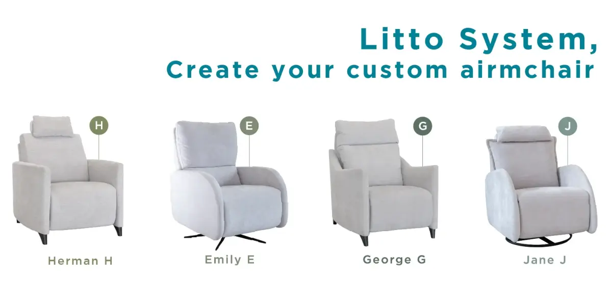 With Litto, you can design your ideal made-to-measure armchair, tailored to your height, your style and your comfort. Choose from 4 backrests, 4 armrests, 3 seat heights, with fixed legs, a circular base or a swivel base… And thanks to an innovative system, you can also select two different seat depths.