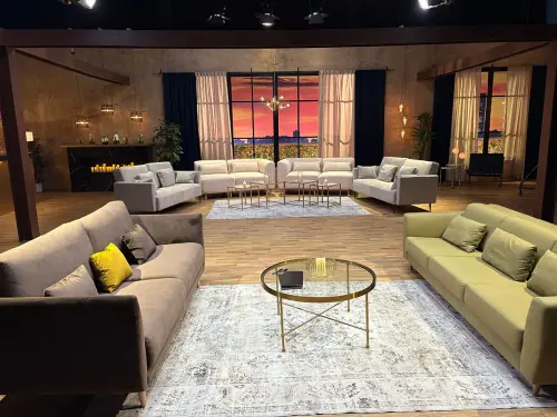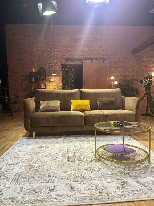 At the back of the set, two Monroe sofas from Moonap complete the atmosphere, providing a contemporary aesthetic and a comfortable space for the conversations that take place during the programme.