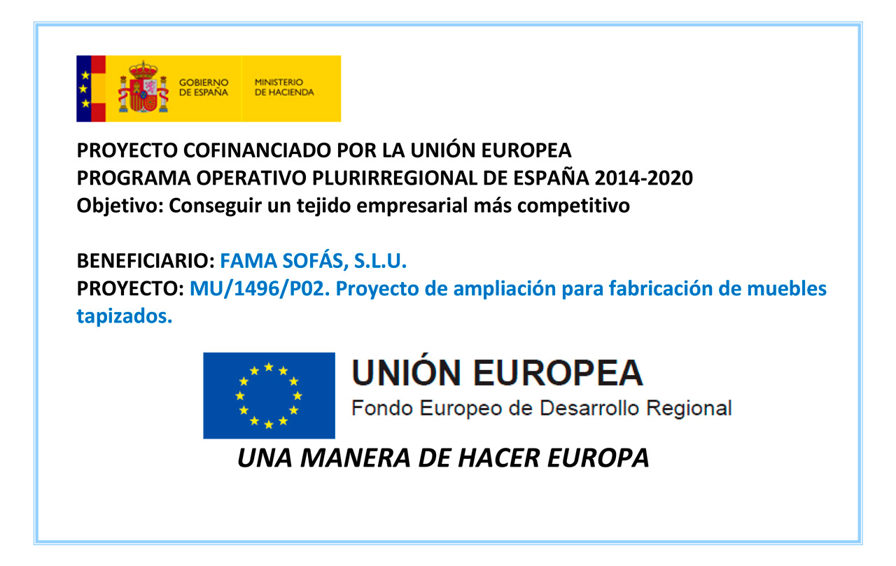 FAMA SOFÁS, S.L.U has been beneficiary of the Multi-regional Operational Program of Spain 2014-2020 for the development of the Expansion Project for the manufacture of upholstered furniture, MU/1496/P02. The project was co-funded by the European Union with the aim of achieving a more competitive business network.