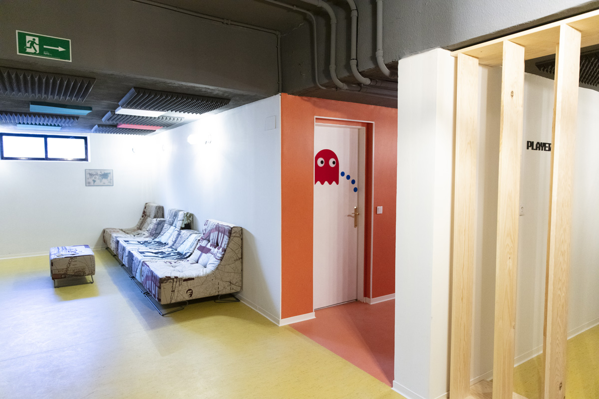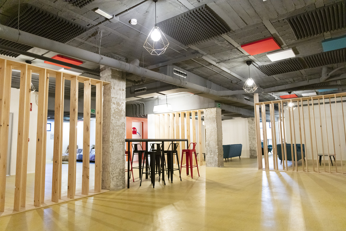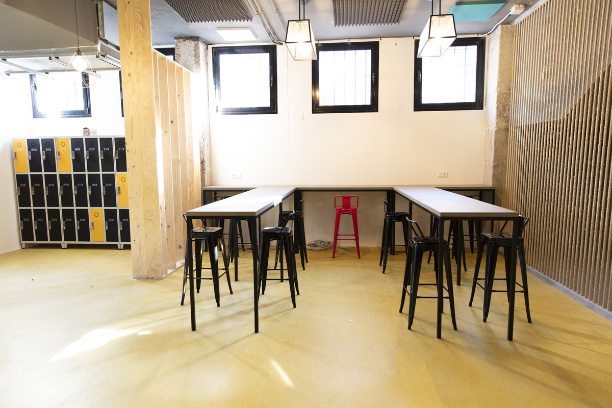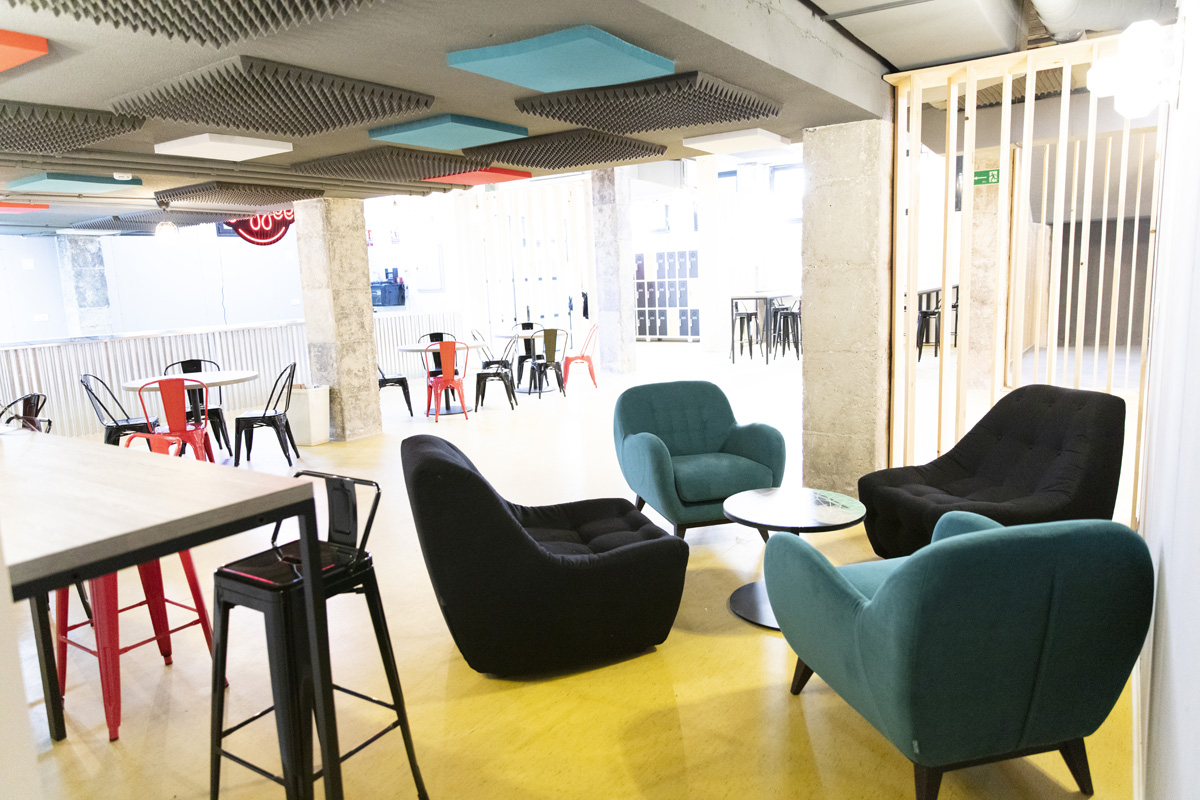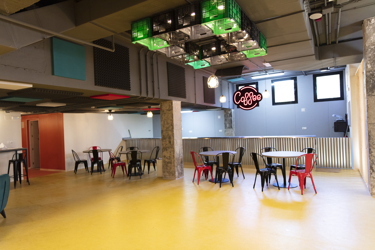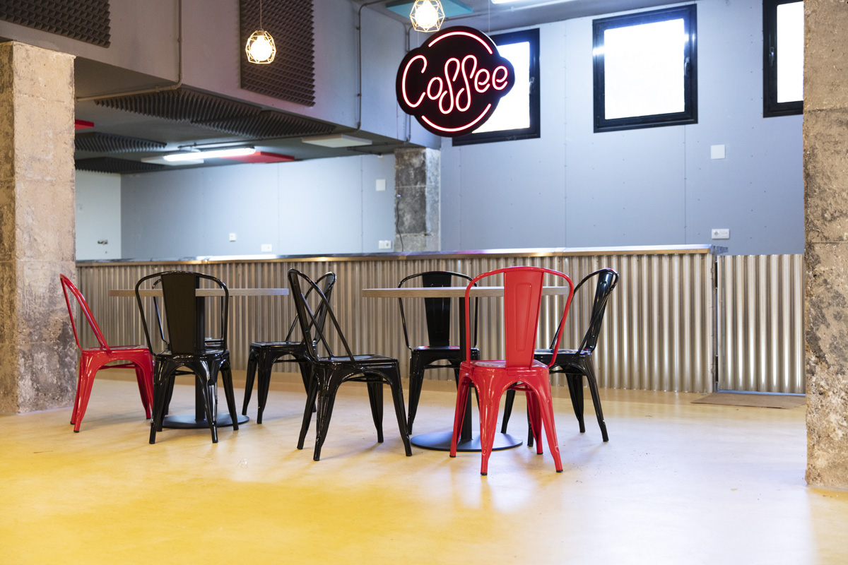 Apart from the different types of seating, the installation includes high tables with stools, tables and chairs for the Coffee area, as well as all the sign plates that include joking and funny messages. The acoustic insulation panels of different colours fixed to the ceiling, as well as the lockers with a password, are some of the elements that complete the project.